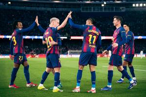 (260126) — BARCELONA, 26 enero, 2026 (Xinhua) — Imagen del 25 de enero de 2026 de jugadores de Barcelona, festejando una anotación durante el partido de fútbol de LaLiga entre Barcelona y Real Oviedo, en el Spotify Camp Nou, en Barcelona, España. (Xinhua/Joan Gosa) (oa) (ah) (vf)