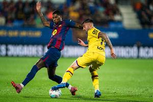 (250922) -- BARCELONA, 22 septiembre, 2025 (Xinhua) -- Imagen del 21 de septiembre de 2025 de Marcus Rashford (i), de FC Barcelona, disputando el balón con Alex Sancris, de Getafe CF, durante el partido de fútbol de LaLiga entre FC Barcelona y Getafe CF, en el Estadio Johan Cruyff, en Barcelona, España. (Xinhua/Joan Gosa) (oa) (ah) (vf)