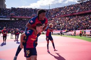 (250512) -- BARCELONA, 12 mayo, 2025 (Xinhua) -- Imagen del 11 de mayo de 2025 de Fermín López (abajo) y Alejandro Balde, de FC Barcelona, festejando una anotación durante el partido de fútbol de LaLiga entre FC Barcelona y Real Madrid, en el Estadio Olímpico Lluís Companys, en Barcelona, España. (Xinhua/Joan Gosa) (rtg) (ah) (vf)