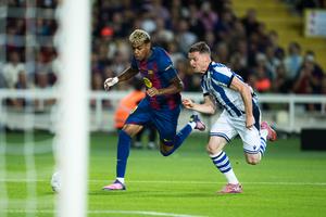 (250929) -- BARCELONA, 29 septiembre, 2025 (Xinhua) -- Imagen del 28 de septiembre de 2025 de Lamine Yamal (i), de FC Barcelona, disputando el balón con Sergio Gómez, de Real Sociedad, durante el partido de fútbol de LaLiga entre FC Barcelona y Real Sociedad, en el Estadio Olímpico Lluís Companys, en Barcelona, España. (Xinhua/Joan Gosa) (oa) (ah) (vf)