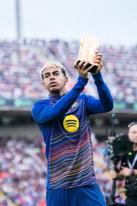 (250929) -- BARCELONA, 29 septiembre, 2025 (Xinhua) -- Imagen del 28 de septiembre de 2025 de Lamine Yamal, de FC Barcelona, mostrando el Trofeo Kopa durante el partido de fútbol de La Liga entre FC Barcelona y Real Sociedad, en el Estadio Olímpico Lluís Companys, en Barcelona, España. (Xinhua/Joan Gosa) (oa) (ah) (vf)