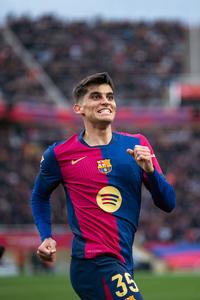 (250303) -- BARCELONA, 3 marzo, 2025 (Xinhua) -- Imagen del 2 de marzo de 2025 de Gerard Martin, de FC Barcelona, festejando su anotación durante el partido de fútbol de LaLiga entre FC Barcelona y Real Sociedad, en el Estadio Olímpico Lluís Companys, en Barcelona, España. (Xinhua/Joan Gosa) (rtg) (ah) (ce)