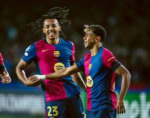 (250312) — BARCELONA, 12 marzo, 2025 (Xinhua) — Imagen del 11 de marzo de 2025 de Lamine Yamal (d), de Barcelona, festejando su anotación con su compañero, Jules Kounde, durante el partido de fútbol de vuelta de octavos de final de la Liga de Campeones de la UEFA entre FC Barcelona y SL Benfica, en Barcelona, España. (Xinhua/Joan Gosa) (ah) (ra) (ce)