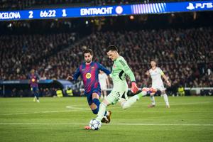 (251210) -- BARCELONA, 10 diciembre, 2025 (Xinhua) -- Imagen del 9 de diciembre de 2025 de Ferran Torres (i-frente), de FC Barcelona, disputando el balón con el guardameta Michael Zetterer (d-frente), de Eintracht Frankfurt, durante el partido de fútbol de la Liga de Campeones de la UEFA entre FC Barcelona y Eintracht Frankfurt, en Barcelona, España. (Xinhua/Joan Gosa) (ah) (ra) (vf)