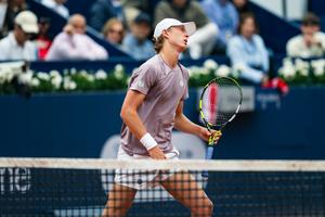 (250416) -- BARCELONA, 16 abril, 2025 (Xinhua) -- Imagen del 15 de abril de 2025 de Ethan Quinn reaccionando durante el partido de primera ronda del Abierto de Barcelona Banc Sabadell entre Carlos Alcaraz, de España, y Ethan Quinn, de Estados Unidos, en Barcelona, España. (Xinhua/Joan Gosa) (ah) (ra) (ce)