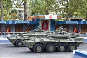 (251013) -- MADRID, 13 octubre, 2025 (Xinhua) -- Imagen del 12 de octubre de 2025 de vehículos militares vistos durante un desfile militar conmemorativo por el Día Nacional, en Madrid, España. (Xinhua/Gustavo Valiente) (oa) (ah) (ce)