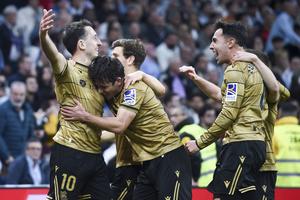 (250402) -- MADRID, 2 abril, 2025 (Xinhua) -- Imagen del 1 de abril de 2025 de jugadores de Real Sociedad festejando una anotación durante el partido de fútbol de la semifinal de vuelta de la Copa del Rey entre Real Madrid y Real Sociedad, en el Estadio Santiago Bernabéu, en Madrid, España. (Xinhua/Gustavo Valiente) (ah) (ra) (ce)
