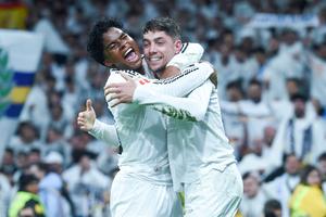 (250421) -- MADRID, 21 abril, 2025 (Xinhua) -- Imagen del 20 de abril de 2025 de Federico Valverde (d), de Real Madrid, festejando su anotación durante el partido de LaLiga española entre Real Madrid y Athletic Bilbao, en Madrid, España. (Xinhua/Gustavo Valiente) (rtg) (ah) (vf)