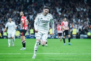 (250421) -- MADRID, 21 abril, 2025 (Xinhua) -- Imagen del 20 de abril de 2025 de Federico Valverde, de Real Madrid, festejando su anotación durante el partido de LaLiga española entre Real Madrid y Athletic Bilbao, en Madrid, España. (Xinhua/Gustavo Valiente) (rtg) (ah) (vf)