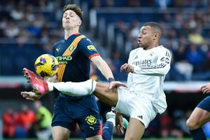 (250224) -- MADRID, 24 febrero, 2025 (Xinhua) -- Imagen del 23 de febrero de 2025 de Kylian Mbappe (d), de Real Madrid, disputando el balón con Ladislav Krejci, de Girona FC, durante el partido de fútbol de Laliga entre Real Madrid y Girona FC, en Madrid, España. (Xinhua/Gustavo Valiente) (oa) (ah) (vf)