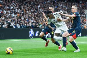 (250224) -- MADRID, 24 febrero, 2025 (Xinhua) -- Imagen del 23 de febrero de 2025 de Vinicius Junior (c), de Real Madrid, disputando el balón con Viktor Tsygankov (d), de Girona FC, durante el partido de fútbol de Laliga entre Real Madrid y Girona FC, en Madrid, España. (Xinhua/Gustavo Valiente) (oa) (ah) (vf)
