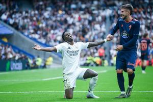 (250505) -- MADRID, 5 mayo, 2025 (Xinhua) -- Imagen del 4 de mayo de 2025 de Vinicius Junior (i), de Real Madrid, reaccionando durante el partido de fútbol de la LaLiga entre Real Madrid y RC Celta, en el Estadio Santiago Bernabéu, en Madrid, España. (Xinhua/Gustavo Valiente) (oa) (ah) (ce)