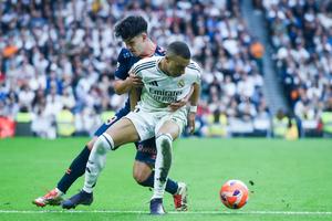(250505) -- MADRID, 5 mayo, 2025 (Xinhua) -- Imagen del 4 de mayo de 2025 de Kylian Mbappe (d), de Real Madrid, disputando el balón con Yoel Lago, de RC Celta, durante el partido de fútbol de la LaLiga entre Real Madrid y RC Celta, en el Estadio Santiago Bernabéu, en Madrid, España. (Xinhua/Gustavo Valiente) (oa) (ah) (ce)