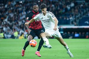 (250515) — MADRID, 15 mayo, 2025 (Xinhua) — Imagen del 14 de mayo de 2025 de Jacobo Ramón (d), de Real Madrid, disputando el balón con Cyle Larin, de RCD Mallorca, durante el partido de fútbol de LaLiga entre Real Madrid y RCD Mallorca, en Madrid, España. (Xinhua/Gustavo Valiente) (rtg) (ra) (vf)