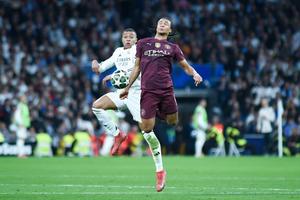 (250220) -- MADRID, 20 febrero, 2025 (Xinhua) -- Imagen del 19 de febrero de 2025 de Kylian Mbappé (i), de Real Madrid, disputando el balón con Nathan Ake, de Manchester City, durante el partido de fútbol de vuelta de play-off de la fase eliminatoria de la Liga de Campeones de la UEFA entre Real Madrid y Manchester City, en Madrid, España. (Xinhua/Gustavo Valiente) (da) (ra) (vf)