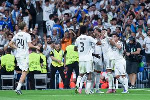 (250917) -- MADRID, 17 septiembre, 2025 (Xinhua) -- Imagen del 16 de septiembre de 2025 de los jugadores de Real Madrid festejando una anotación durante el partido de la primera ronda de la Liga de Campeones de la UEFA, entre Real Madrid y Olympique Marseille, en Madrid, España. (Xinhua/Gustavo Valiente) (ah) (vf)