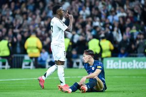 (250123) -- MADRID, 23 enero, 2025 (Xinhua) -- Imagen del 22 de enero de 2025 de Vinicius Junior (i), de Real Madrid, festejando una anotación durante el partido de fútbol de la Liga de Campeones entre Real Madrid y Salzburg, en Madrid, España. (Xinhua/Gustavo Valiente) (da) (ra) (vf)