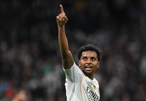 (251211) -- MADRID, 11 diciembre, 2025 (Xinhua) -- Imagen del 10 de diciembre de 2025 de Rodrygo, de Real Madrid, festejando su anotación durante el partido de fútbol de la Liga de Campeones de la UEFA, entre Real Madrid y Manchester City, en Madrid, España. (Xinhua/Cheng Min) (rtg) (ra) (vf)
