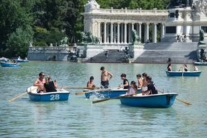 (250805) -- MADRID, 5 agosto, 2025 (Xinhua) -- Imagen del 4 de agosto de 2025 de personas remando en botes en un jardín, en Madrid, España. Alertas por golpe de calor fueron emitidas en muchos lugares de España mientras el país se ve afectado por una abrasadora ola de calor. (Xinhua/Gustavo Valiente) (jg) (ra) (vf)