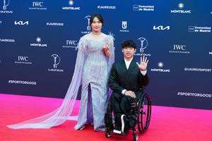 (250422) -- MADRID, 22 abril, 2025 (Xinhua) -- Imagen del 21 de abril de 2025 de la nadadora paralímpica china, Jiang Jiang (i), y el jugador chino de bádminton en silla de ruedas, Qu Zimo, posando en la alfombra roja previo a la ceremonia de los Premios Laureus del Deporte Mundial 2025, en Madrid, España. (Xinhua/Peng Ziyang) (oa) (ah) (ce)