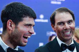 (250422) -- MADRID, 22 abril, 2025 (Xinhua) -- Imagen del 21 de abril de 2025 de los tenistas españoles, Carlos Alcaraz (i), y Rafael Nadal, hablando con la prensa a su llegada a la ceremonia de los Premios Laureus del Deporte Mundial 2025, en Madrid, España. (Xinhua/Peng Ziyang) (oa) (ah) (ce)