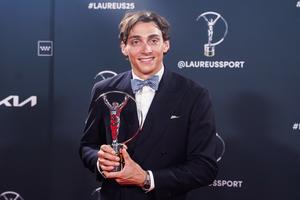 (250422) -- MADRID, 22 abril, 2025 (Xinhua) -- Imagen del 21 de abril de 2025 del atleta sueco, Mondo Duplantis, posando con el premio al Deportista Mundial del Año durante la ceremonia de los Premios Laureus del Deporte Mundial 2025, en Madrid, España. (Xinhua/Peng Ziyang) (oa) (ah) (ce)