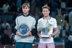 (250505) -- MADRID, 5 mayo, 2025 (Xinhua) -- Imagen del 4 de mayo de 2025 de Casper Ruud (d) y Jack Draper posando para fotografías durante la ceremonia de premiación de la final de individuales masculinos, en el torneo de tenis Madrid Open de la ATP Tour 2025, en la Caja Mágica, Madrid, España. (Xinhua/Gustavo Valiente) (rtg) (ah) (vf)