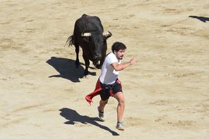 (250829) -- MADRID, 29 agosto, 2025 (Xinhua) -- Imagen del 28 de agosto de 2025 de un toro persiguiendo a un hombre en una plaza de toros, en San Sebastián de los Reyes, España. La fiesta anual de los encierros se celebra aquí la última semana de agosto. (Xinhua/Gustavo Valiente) (oa) (ra) (ce)