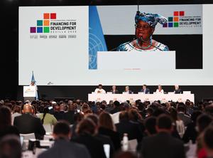(250630) -- SEVILLA, 30 junio, 2025 (Xinhua) -- La directora general de la Organización Mundial del Comercio (OMC), Ngozi Okonjo-Iweala, habla durante la sesión de inauguración de la IV Conferencia Internacional sobre Financiación para el Desarrollo, en Sevilla, España, el 30 de junio de 2025. La IV Conferencia Internacional sobre Financiación para el Desarrollo, centrada en cuestiones de financiación del desarrollo mundial, se celebró desde el lunes y continuará hasta el jueves, con la participación de representantes de gobiernos, organizaciones internacionales, instituciones financieras, comunidades empresariales, entre otros. (Xinhua/Li Jing) (rtg) (oa) (ce)