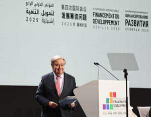 (250630) -- SEVILLA, 30 junio, 2025 (Xinhua) -- El secretario general de la ONU, António Guterres, reacciona durante la sesión de inauguración de la IV Conferencia Internacional sobre Financiación para el Desarrollo, en Sevilla, España, el 30 de junio de 2025. La IV Conferencia Internacional sobre Financiación para el Desarrollo, centrada en cuestiones de financiación del desarrollo mundial, se celebró desde el lunes y continuará hasta el jueves, con la participación de representantes de gobiernos, organizaciones internacionales, instituciones financieras, comunidades empresariales, entre otros. (Xinhua/Li Jing) (rtg) (oa) (ce)