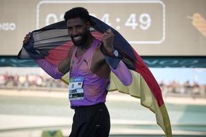 (251208) -- VALENCIA, 8 diciembre, 2025 (Xinhua) -- Imagen del 7 de diciembre de 2025 de Amanal Petros, de Alemania, festejando al término del Maratón Valencia Trinidad Alfonso 2025, en Valencia, España. (Xinhua) (oa) (ah) (vf)