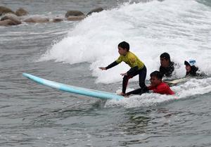 (241020) -- LIMA, 20 octubre, 2024 (Xinhua) -- Un niño surfea una ola con la ayuda de un instructor durante una clase de surf en la playa San Bartolo, en el sur de Lima, Perú, el 20 de octubre de 2024. (Xinhua/Mariana Bazo) (mb) (oa) (ah) (da)