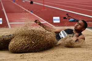 (250622) -- JOHVI, 22 junio, 2025 (Xinhua) -- Imagen del 21 de junio de 2025 de José Luis Mandros, de Perú, compitiendo durante el evento de salto de longitud masculino en el Continental Tour 2025 Conmemorativo de Heino Lipp de World Athletics, en Johvi, Estonia. (Xinhua/Sergei Stepanov) (rtg) (da)