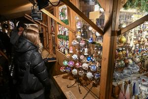 (251221) -- TALLIN, 21 diciembre, 2025 (Xinhua) -- Imagen del 20 de diciembre de 2025 de personas eligiendo adornos navideños hechos a mano en un mercado navideño en la Plaza del Ayuntamiento, en Tallin, Estonia. (Xinhua/Sergei Stepanov) (ah) (da)