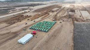 (260429) -- ADIS ABEBA, 29 abril, 2026 (Xinhua) -- Vista aérea del 29 de abril de 2026 de camiones eléctricos de gran tonelaje en la obra del Aeropuerto Internacional de Bishoftu, cerca de la ciudad de Bishoftu, en el estado regional de Oromia, Etiopía. China Communications Construction Company (CCCC) presentó el miércoles 50 camiones eléctricos de gran tonelaje en la obra del megaproyecto aeroportuario de Etiopía, promoviendo la movilidad sostenible y el desarrollo de los sectores logístico y de la construcción del país. (Xinhua/CCCC) (da) (vf)