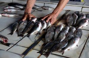 (240816) -- LIMA, 16 agosto, 2024 (Xinhua) -- Un vendedor acomoda pescado en el mercado del muelle de pescadores, en el distrito de Chorrillos, en Lima, Perú, el 16 de agosto de 2024. La producción nacional de Perú acumuló un crecimiento de 2,49 por ciento en el primer semestre del año, luego de expandirse 0,21 por ciento durante junio último, informó el jueves el Instituto Nacional de Estadística e Informática (INEI). (Xinhua/Mariana Bazo) (mb) (jg) (rtg) (vf)