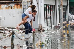 (251110) -- CIUDAD DE NAVOTAS, 10 noviembre, 2025 (Xinhua) -- Un hombre carga a una mujer en su espalda mientras vadea a través de agua de inundación, en la Ciudad de Navotas, Filipinas, el 10 de noviembre de 2025. El supertifón Fung-wong tocó tierra el domingo por la noche en la provincia Aurora en la zona oriental de la isla de Luzón de Filipinas, informó la oficina meteorológica estatal. (Xinhua/Rouelle Umali) (rtg) (ah) (ce)