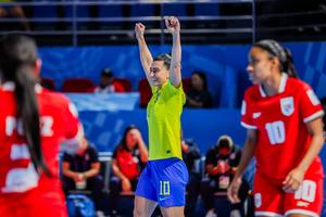 (251129) — CIUDAD DE PASIG, 29 noviembre, 2025 (Xinhua) — Lucileia (c), de Brasil, festeja después de realizar una anotación durante el partido del grupo D entre Panamá y Brasil en la Copa Mundial Femenina de Futsal de la FIFA 2025, en la Ciudad de Pasig, Filipinas, el 29 de noviembre de 2025. (Xinhua/Rouelle Umali) (rtg) (da)