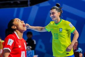 (251129) — CIUDAD DE PASIG, 29 noviembre, 2025 (Xinhua) — Lucileia (d), de Brasil, festeja después de realizar una anotación durante el partido del grupo D entre Panamá y Brasil en la Copa Mundial Femenina de Futsal de la FIFA 2025, en la Ciudad de Pasig, Filipinas, el 29 de noviembre de 2025. (Xinhua/Rouelle Umali) (rtg) (da)