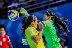 (251129) -- CIUDAD DE PASIG, 29 noviembre, 2025 (Xinhua) -- Diana (i-frente), de Brasil, disputa el balón con la guardameta Nadia Ducreux, de Panamá, durante el partido del grupo D entre Panamá y Brasil en la Copa Mundial Femenina de Futsal de la FIFA 2025, en la Ciudad de Pasig, Filipinas, el 29 de noviembre de 2025. (Xinhua/Rouelle Umali) (rtg) (da)