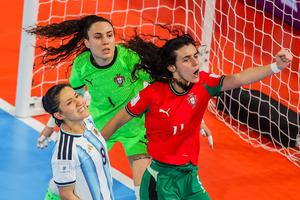 (251205) -- CIUDAD DE PASIG, 5 diciembre, 2025 (Xinhua) -- La guardameta Ana Catarina (c), y Carolina Pedreira (d), de Portugal, reaccionan después de bloquear el intento de anotación de Ana Ontiveros, de Argentina, durante el partido de semifinal entre Argentina y Portugal en la Copa Mundial Femenina de Futsal de la FIFA 2025, en la Ciudad de Pasig, Filipinas, el 5 de diciembre de 2025. (Xinhua/Rouelle Umali) (rtg) (ra) (vf)