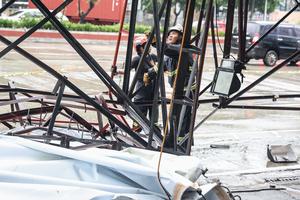 (250719) -- CIUDAD QUEZON, 19 julio, 2025 (Xinhua) -- Rescatistas trabajan en el sitio de un colapso de una valla publicitaria debido a los fuertes vientos, en Ciudad Quezon, Filipinas, el 19 de julio de 2025. Wipha se intensificó hasta convertirse en una severa tormenta tropical a medida que se alejaba de Filipinas el sábado, trayendo fuertes vientos y lluvias torrenciales a muchas áreas. (Xinhua/Rouelle Umali) (da)