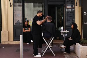 (250524) -- CANNES, 24 mayo, 2025 (Xinhua) -- Un barbero le corta el cabello a un cliente afuera de una tienda después de un corte de electricidad, en Cannes, en el sur de Francia, el 24 de mayo de 2025. La prefectura del departamento de Alpes Marítimos, en el sur de Francia, confirmó el sábado que un corte de electricidad está afectando la zona oeste del departamento, incluida Cannes y sus alrededores. Los organizadores del 78 Festival de Cine de Cannes informaron que, gracias a un suministro eléctrico independiente, todos los eventos y proyecciones programados, incluida la Ceremonia de Clausura, se desarrollarán según lo planeado y en condiciones normales. (Xinhua/Gao Jing) (jg) (da)