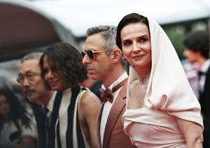 (250514) -- CANNES, 14 mayo, 2025 (Xinhua) -- Imagen del 13 de mayo de 2025 de la actriz francesa y presidenta del jurado del 78 Festival de Cine de Cannes, Juliette Binoche (d), llegando con miembros del jurado a la alfombra roja de la ceremonia de apertura del festival, en Cannes, Francia. (Xinhua/Gao Jing) (ah) (ra) (ce)