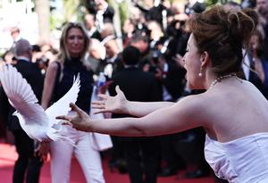 (250516) -- CANNES, 16 mayo, 2025 (Xinhua) -- Imagen del 15 de mayo de 2025 de una invitada llegando a la alfombra roja con una paloma previo al estreno de "Dossier 137" del director de cine francés, Dominik Moll, durante la 78 edición del Festival de Cine de Cannes, en Cannes, en el sur de Francia. (Xinhua/Gao Jing) (oa) (ra) (vf)