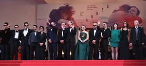 (250519) -- CANNES, 19 mayo, 2025 (Xinhua) -- Imagen del 18 de mayo de 2025 de la ministra de Cultura francesa, Rachida Dati (5-i) y miembros del elenco, llegando a la proyección de la película "The Phoenician Scheme" en la 78 edición del Festival de Cine de Cannes, en Cannes, en el sur de Francia. (Xinhua/Gao Jing) (rtg) (ah) (vf)