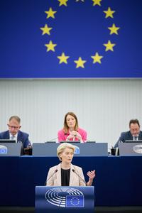 (250401) -- ESTRASBURGO, 1 abril, 2025 (Xinhua) -- La presidenta de la Comisión Europea, Ursula von der Leyen, pronuncia un discurso en el Parlamento Europeo, en Estrasburgo, Francia, el 1 de abril de 2025. La Unión Europea tiene un plan sólido para tomar represalias contra los aranceles estadounidenses y no dudará en actuar si es necesario, dijo von der Leyen el martes. (Xinhua/Unión Europea) (oa) (ah) (ce)