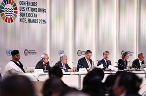 (250609) -- NIZA, 9 junio, 2025 (Xinhua) -- El presidente francés, Emmanuel Macron (3-d), habla durante la sesión de inauguración de la Tercera Conferencia de las Naciones Unidas sobre el Océano 2025 (UNOC3), en Niza, Francia, el 9 de junio de 2025. La UNOC3 se inauguró el lunes en Niza, una ciudad costera en el sur de Francia, bajo el tema "Acelerar la acción y movilizar a todos los actores para conservar y utilizar sosteniblemente el océano". (Xinhua/Gao Jing) (rtg) (oa) (ce)