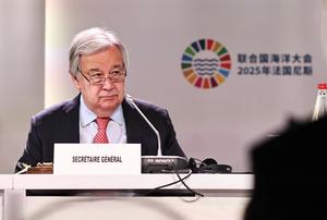 (250609) -- NIZA, 9 junio, 2025 (Xinhua) -- El secretario general de la Organización de las Naciones Unidas (ONU), António Guterres, asiste a la sesión de inauguración de la Tercera Conferencia de las Naciones Unidas sobre el Océano 2025 (UNOC3), en Niza, Francia, el 9 de junio de 2025. La UNOC3 se inauguró el lunes en Niza, una ciudad costera en el sur de Francia, bajo el tema "Acelerar la acción y movilizar a todos los actores para conservar y utilizar sosteniblemente el océano". (Xinhua/Gao Jing) (rtg) (oa) (ce)