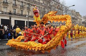 (260202) -- PARIS, 2 febrero, 2026 (Xinhua) -- Imagen del 1 de febrero de 2026 de personas realizando una danza del dragón durante un desfile para celebrar el próximo Año Nuevo chino en la avenida de los Campos Elíseos, en París, Francia. (Xinhua/Zhang Baihui) (oa) (ah) (vf)